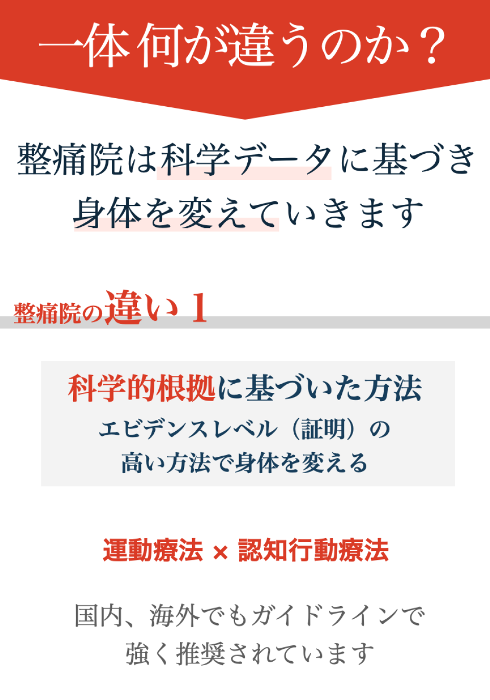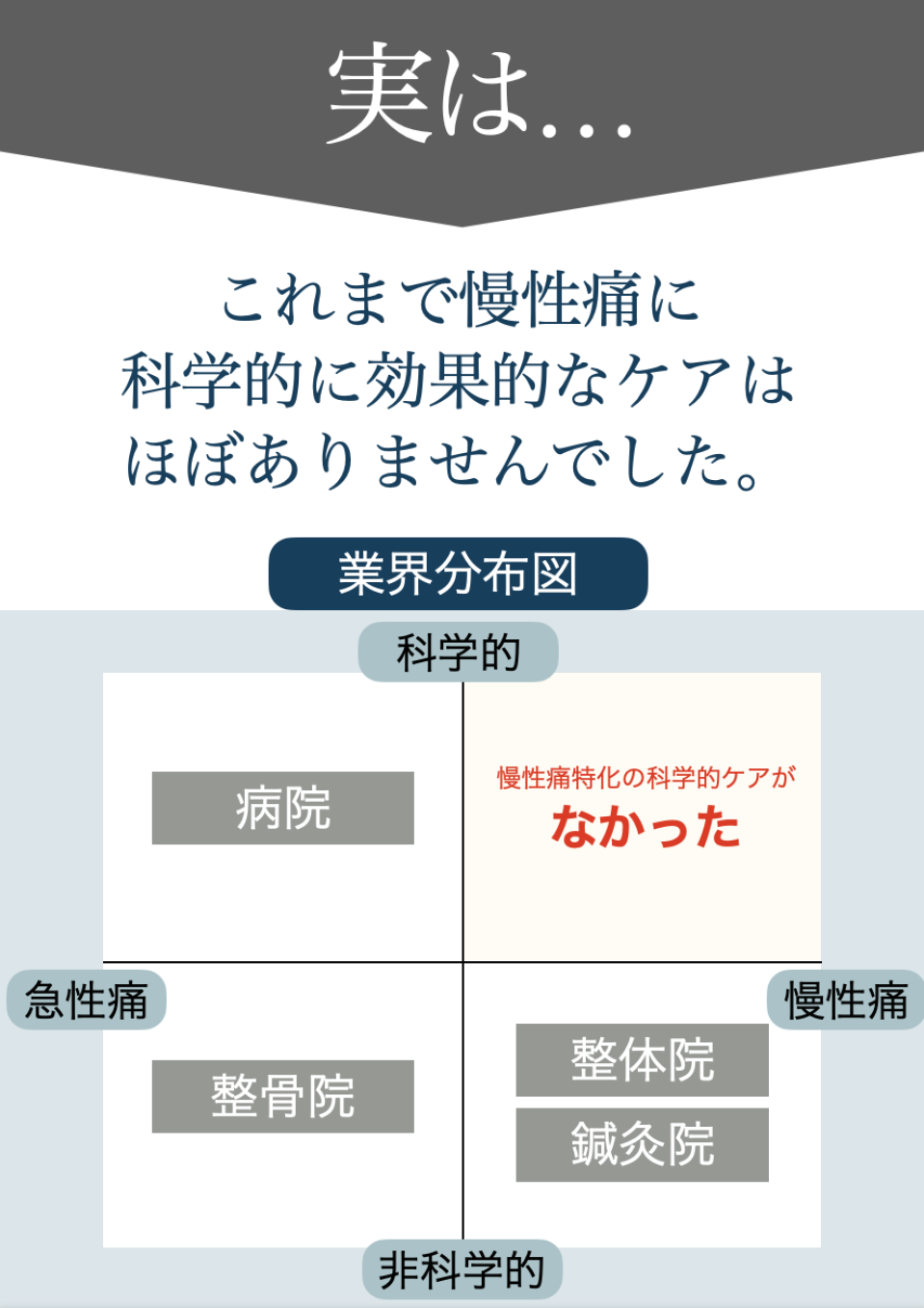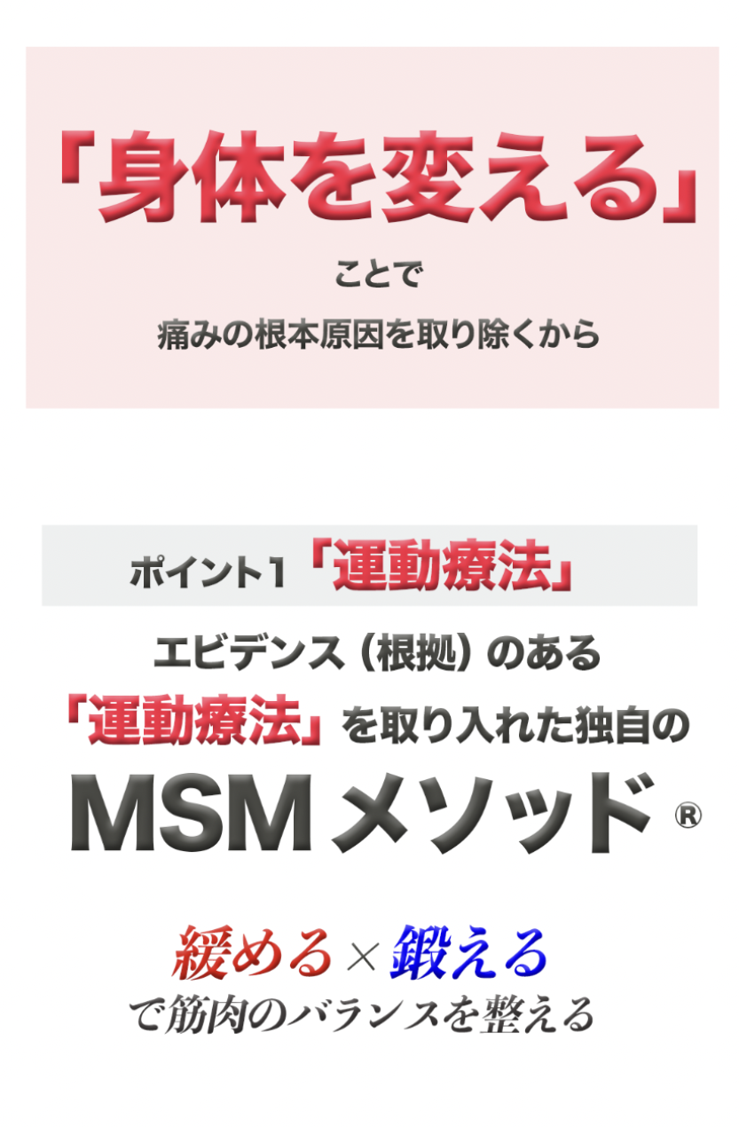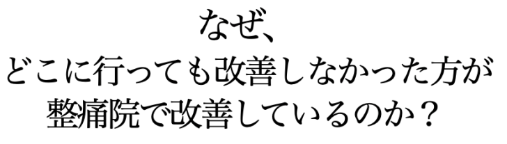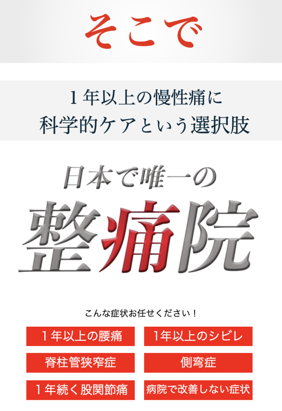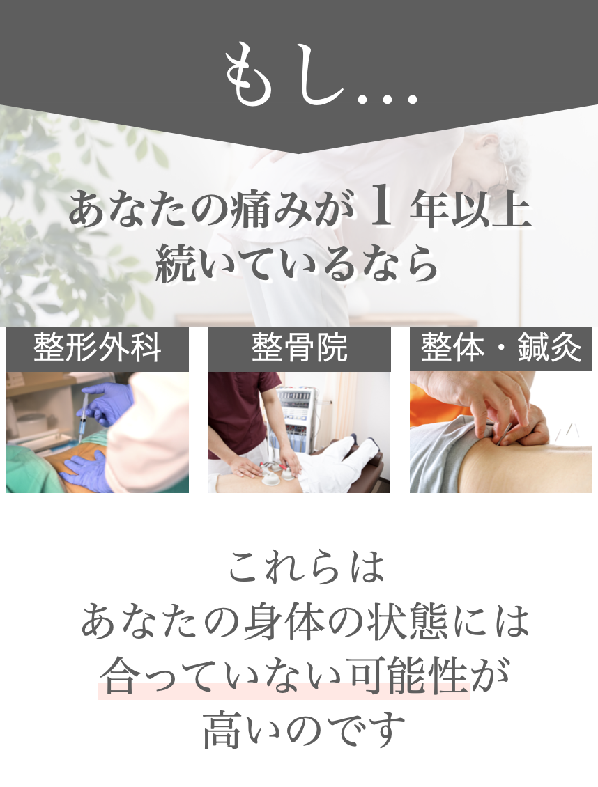 とことん痛みを理解すること、その上で改善への道すじを示すことで、1つ1つ不安を取り除きます。そして、医学的に根拠が示されている病院でもない、整骨院でもない方法で体を、痛みを整えていきます。根拠のある「整痛」をまずは体験して下さい。