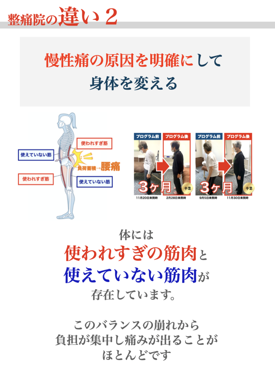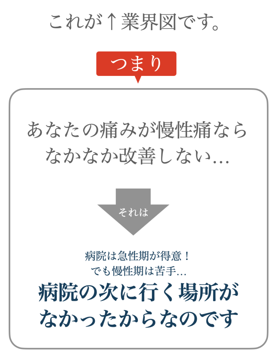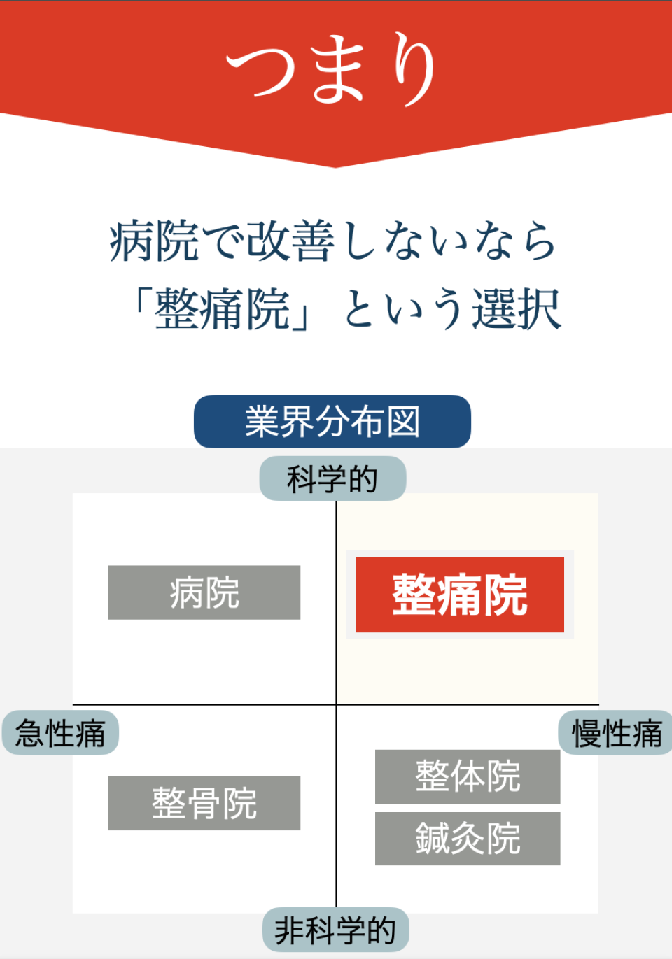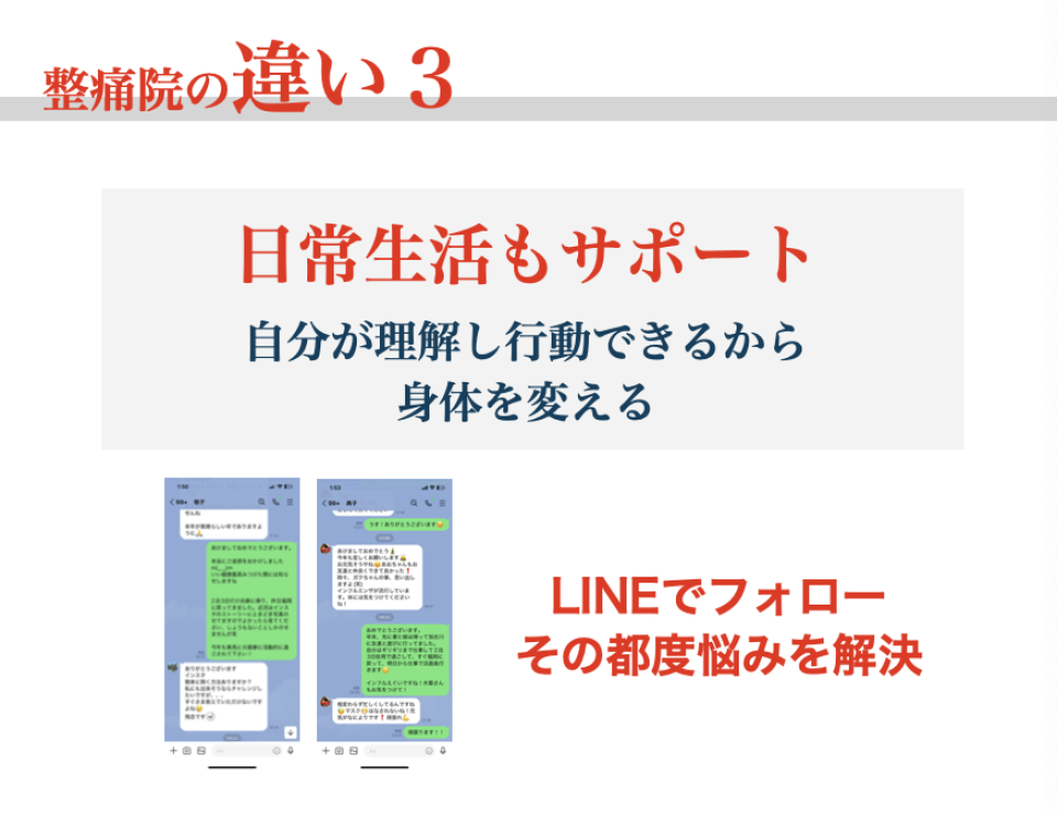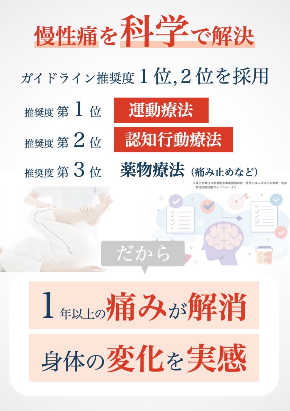 とことん痛みを理解すること、その上で改善への道すじを示すことで、1つ1つ不安を取り除きます。そして、医学的に根拠が示されている病院でもない、整骨院でもない方法で体を、痛みを整えていきます。根拠のある「整痛」をまずは体験して下さい。