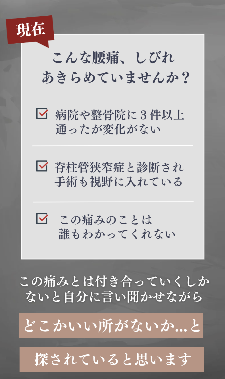 整痛院ふっか-銀座-は、痛みやしびれの症状で悩む方の解決の場所になります。特に、1年以上痛みが続いている方、3件以上整形外科や整骨院に行っても改善していない方は、痛みの原因がわからない、自分の痛みの辛さをわかってもらえない、解決方法がわからないなど非常に悩みが深く、不安に襲われている方がほとんどです。もし、あなたがそのような状態であれば、私たちが全力でお救い致します。